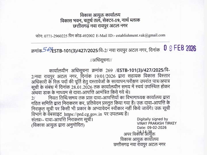 सहायक विकास विस्तार अधिकारी भर्ती हेतु दावा-आपत्ति निराकरण सूची जारी रायपुर- विकास आयुक्त कार्यालय, छत्तीसगढ़ नवा रायपुर...