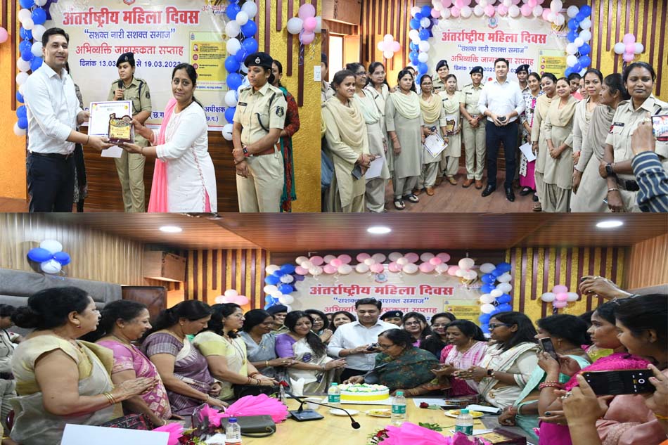 राहुल गौतम-राजनांदगांव : दिनांक 17.03.2023 को राजनांदगांव वरिष्ठ पुलिस अधीक्षक अभिषेक मीणा के निर्देशन मे अति. पुलिस अधीक्षक (आईयूसीएडब्ल्यू) पद्मश्री तवंर, उप पुलिस अधीक्षक (आईयूसीएडब्ल्यू) नेहा वर्मा, मार्गदर्शन में पुलिस कार्यालय स्थित जनसंवाद सभागृह में विभिन्न क्षेत्रों में विशेष कार्य करने वाली जिले के प्रतिष्ठित महिलाओं को विभिन्न क्षेत्रों में महिला शसक्तिकरण में किये गये कार्य तथा शासकीय विभागों में कार्यरत महिला अधिकारी/कर्मचारियों को उनके विभाग व समाज के लिए सराहनीय कार्य के लिए वरिष्ठ पुलिस अधीक्षक अभिषेक मीणा द्वारा सम्मानित किया गया.