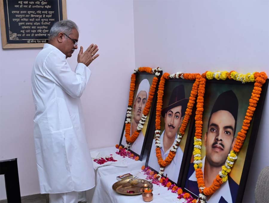 मुख्यमंत्री भूपेश बघेल ने आज अपने निवास कार्यालय में भारतीय स्वतंत्रता संग्राम के अमर सेनानी भगत सिंह, राजगुरू और सुखदेव के शहादत दिवस पर उनके छायाचित्र पर पुष्प अर्पित कर उन्हें नमन किया. मुख्यमंत्री श्री बघेल ने कहा कि आजादी के इन महानायकों ने मातृभूमि के लिए हंसते-हंसते अपने प्राण न्यौछावर कर दिए. उन्होंने अपने बलिदान से देशवासियों में आजादी की भावना को और अधिक प्रबल किया. भगत सिंह, राजगुरू और सुखदेव भारत माता के सच्चे सपूत थे, जिनका बलिदान युवाओं को देश के लिए सर्वस्व समर्पण की प्रेरणा देता रहेगा.