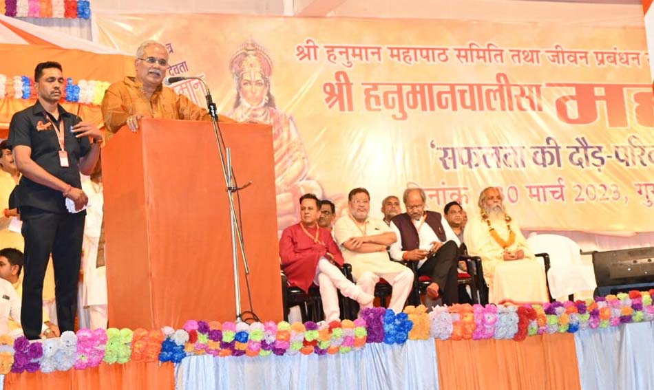 रायपुर : मुख्यमंत्री भूपेश बघेल कल शाम राजधानी रायपुर के बलवीर सिंह जुनेजा इंडोर स्टेडियम परिसर में श्री हनुमान महापाठ समिति तथा जीवन प्रबंधन समूह रायपुर द्वारा आयोजित श्री हनुमान चालीसा महापाठ कार्यक्रम में शामिल हुए. इस अवसर पर मुख्यमंत्री ने उपस्थित सभी हनुमान भक्तों के साथ हनुमान चालीसा का पाठ किया. कार्यक्रम में मुख्यमंत्री श्री बघेल ने पंडित विजयशंकर मेहता द्वारा ‘सफलता की दौड़-परिवार मत तोड़’ विषय पर व्याख्यान का श्रवण किया.