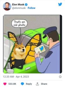 एलन मस्क के ट्वीट के बाद स्पष्ट हो गया कि ट्विटर का लोगो बदल दिया गया है. देर रात करीब 12:20 बजे एलन मस्क ने एक फोटो ट्वीट की. इसमें एक डॉगी नजर आ रहा था. डॉगी कार की ड्राइविंग सीट पर बैठा हुआ है और वह ट्रैफिक पुलिस को अपना लाइसेंस दिखा रहा है. इस लाइसेंस में नीली चिड़िया (ट्विटर का पुराना लोगो) की फोटो है. जिसके बाद डॉगी ट्रैफिक पुलिस से कह रहा है, “ये पुरानी फोटो है”.
