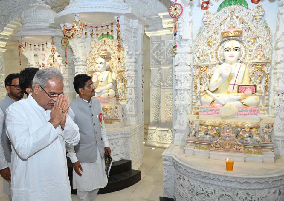 रायपुर : मुख्यमंत्री भूपेश बघेल मंगलवार को देर रात राजधानी रायपुर के एमजी रोड स्थित जैन दादाबाड़ी में सकल जैन श्रीसंघ द्वारा आयोजित भगवान महावीर जन्मकल्याणक महोत्सव में सम्मिलित हुए. मुख्यमंत्री श्री बघेल ने दादाबाड़ी परिसर स्थित जैन मंदिर में पूजा-अर्चना कर प्रदेशवासियों की सुख, समृद्धि और खुशहाली की कामना की. इस अवसर पर भगवान महावीर जन्म कल्याणक महोत्सव समिति से अध्यक्ष मनोज कोठारी, सुशील कोचर, विजय गंगवाल, पारस चोपड़ा सहित समिति के अनेक सदस्यगण उपस्थित रहे.