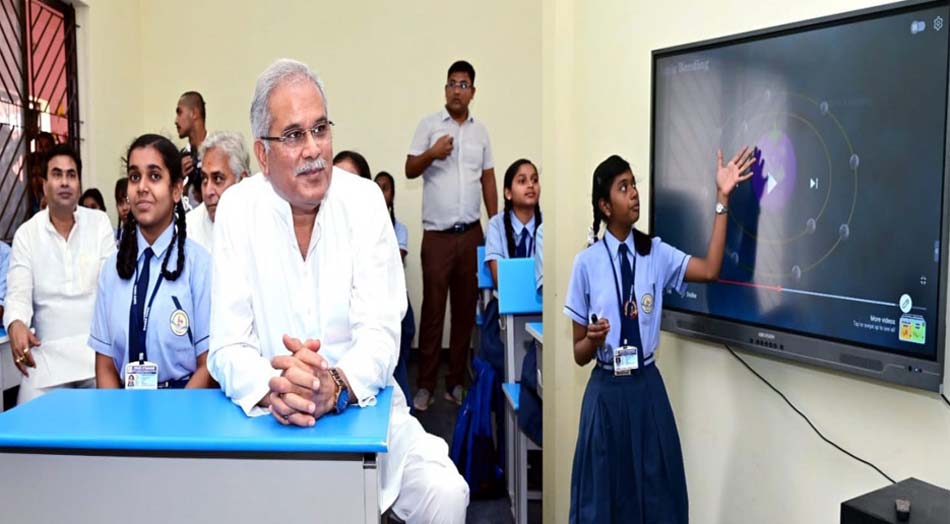 स्मार्ट क्लास रुम के अवलोकन के दौरान दसवीं की छात्रा भूमिका यादव ने मुख्यमंत्री और अन्य अतिथियों को स्मार्ट बोर्ड के माध्यम से स्मार्ट क्लास रुम में अध्यापन का डेमो दिया. अपनी सरकार द्वारा हर वर्ग के बच्चों तक अंग्रेजी माध्यम में पढ़ाई की पहुंच सुनिश्चित करने शुरू किए गए स्वामी आत्मानंद अंग्रेजी माध्यम स्कूल के आधुनिक स्मार्ट क्लास रुम में पढ़ाई का अनुभव महसूस करना और एक सरकारी स्कूल की कक्षा दसवीं की छात्रा को धाराप्रवाह अंग्रेजी में पढ़ाते देखना मुख्यमंत्री भूपेश बघेल को भी बेहद संतोष प्रदान कर रहा था. उनके चेहरे पर इसकी खुशी देखते ही बन रही थी.