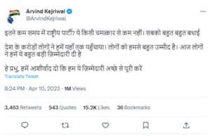 दिल्ली के मुख्यमंत्री निर्वाचन आयोग के इस फैसले से बहुत खुश हैं. उन्होंने आम आदमी पार्टी को राष्ट्रीय दल की मान्यता मिलने पर ट्वीट किया, “इतने कम समय में राष्ट्रीय पार्टी? ये किसी चमत्कार से कम नहीं. सबको बहुत बहुत बधाई. देश के करोड़ों लोगों हमे यहाँ तक पहुंचाया. लोगों को हमसे बहुत उम्मीद है. आज लोगों ने हमें बहुत बड़ी जिम्मेदारी दी है.” बता दें की फिलहाल पंजाब और दिल्ली में AAP की सरकार बनी हुई है. जल्द ही कर्नाटक चुनाव होने वाले हैं.
