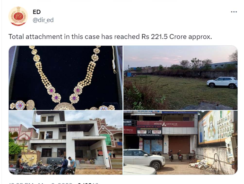 इस वक्त की बड़ी खबर आ रही है की ईडी ने चुनाव महौल के बीच अलग-अलग नेताओं और कारोबारी के यहां छापा मारा है. जिसमें भिलाई नगर कांग्रेस विधायक देवेंद्र यादव, आईएएस रानू साहू, विधायक चंद्रदेव राय और कारोबारी सूर्यकांत तिवारी की संपत्ति अटैच कर ली गई है. ईडी ने अभी अभी अपने आधिकारिक ट्वीटर हैंडल से यह जानकारी साझा की है. आदेश के तहत कुल 51.4 करोड़ की प्रापर्टी ईडी ने अटैच किया है.