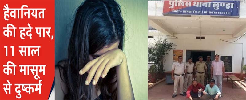 सरगुजा- जिले में एक बार फिर हैवानियत की हदे पार कर देने 11 साल की मासूम बच्ची से सामूहिक दुष्कर्म का मामला सामने आया है. समूहिक दुष्कर्म की शिकायत पीड़िता के पिता ने 15 मई को लुंड्रा पुलिस थाना में दर्ज कराई थी. यह घटना स्कूल में पढ़ने वाले नाबालिग लड़की के साथ गैंगरेप की घटना अंबिकापुर के लुंड्रा थाना क्षेत्र का है.यह मामला सोमवार की बताई जा रही है, जिसकी शिकायत मिलते ही सरगुजा पुलिस ने 2 आरोपियों को गिरफ्तार किया है. घटना के तीन दिन बाद पीड़ित बच्चीं की मां के मायके से वापस लौटने के बाद इस मामले का खुलासा हो सका. जिसके बाद पुलिस ने घटना में शामिल दोनों आरोपी युवको को गिरफ्तार कर लिया हैं.