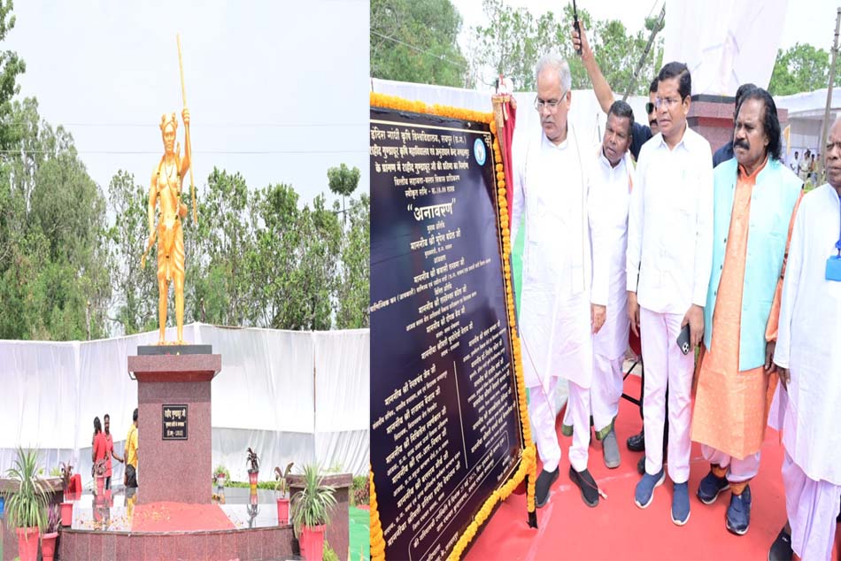 रायपुर : मुख्यमंत्री भूपेश बघेल अपने एक दिवसीय बस्तर प्रवास के दौरान कुमरावंड स्थित शहीद गुंडाधुर कृषि महाविद्यालय परिसर में भूमपाल विद्रोह के जननायक रहे वीर गुंडाधुर की आदमकद प्रतिमा का अनावरण किया.