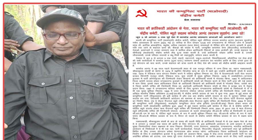 नक्सली लीडर ईनामी नक्सली का हार्ट अटैक से मौत हो गई है. नक्सलियों ने प्रेस रिलीज जारी कर नक्सली लीडर कटकम सुदर्शन की मौत की जानकारी दी है. कटकम सुदर्शन नक्सलियों की केंद्रीय कमेटी के पोलित ब्यूरो का सदस्य था. ईनामी नक्सली की मौत हो गई. देश में अबतक जितनी भी बड़ी नक्सली घटना हुई है, सभी में कटकम सुदर्शन को मास्टर माइंड माना जाता है. जानकारी के मुताबिक 31 मई को माओवादियों के गोरिल्ला ज़ोन में आनंद उर्फ़ कटकम सुदर्शन की मौत हुई है. माओवादियों ने आनंद की मौत पर देश भर में 5 जून से 3 अगस्त तक संस्मरण सभाएँ करने का आह्वान किया है. नक्सलियों ने प्रेस नोट में बताया है कि कटकम सुदर्शन की 31 मई को दोपहर 12 बजकर 20 मिनट में हार्ट अटैक से मौत हुई है. प्रेसनोट के साथ-साथ पोलित ब्यूरो मेंबर कटकम सुदर्शन की मौत के बाद की तस्वीरें भी जारी की है.