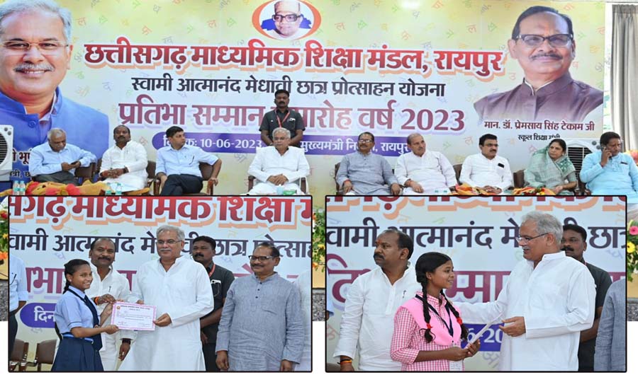 मुख्यमंत्री श्री बघेल ने आज स्वामी आत्मानंद मेधावी छात्र प्रोत्साहन योजना अंतर्गत छत्तीसगढ़ माध्यमिक शिक्षा मंडल की वर्ष 2023 की वार्षिक परीक्षा में कक्षा 10वीं और 12वीं प्रावीण्य सूची में स्थान प्राप्त करने वाले छात्र-छात्राओं को सम्मानित किया. समारोह में सभी मेधावी छात्र-छात्राओं को डेढ़-डेढ़ लाख रूपये की प्रोत्साहन राशि प्रदान की गई. मुख्यमंत्री भूपेश बघेल ने समारोह में प्रोत्साहन राशि को मेधावी छात्र-छात्राओं के बैंक खाते आरटीजीएस के माध्यम से ट्रांसफर किया. प्रतिभा सम्मान समारोह का आयोजन मुख्यमंत्री निवास में किया गया.