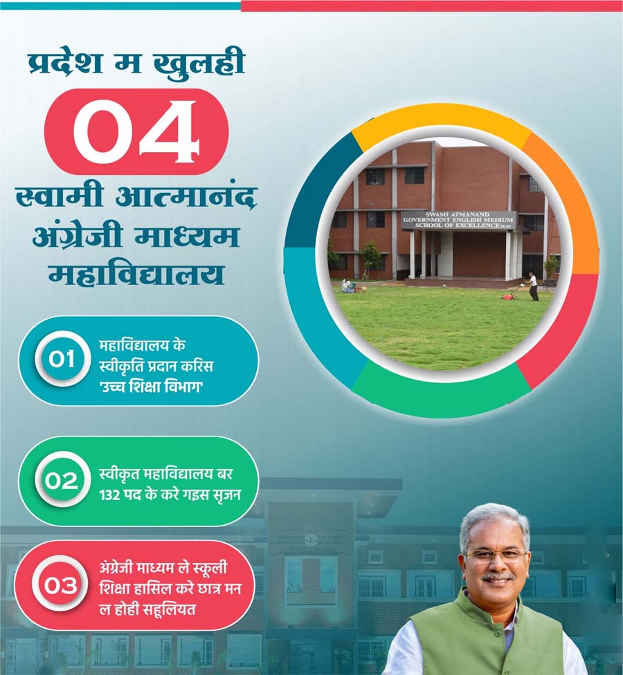 प्रदेश में स्कूली बच्चों को अंग्रेजी माध्यम में शिक्षा प्रदान करने के उद्देश्य से मुख्यमंत्री भूपेश बघेल की पहल पर राज्य में स्वामी आत्मानंद अंग्रेजी माध्यम स्कूल प्रारंभ किए जाने के बाद अब स्वामी आत्मानंद शासकीय अंग्रेजी माध्यम आदर्श महाविद्यालय की स्थापना की जा रही है. उच्च शिक्षा विभाग द्वारा प्रदेश में 4 महाविद्यालयों की स्वीकृति प्रदान कर दी गई है. इससे अंग्रेजी माध्यम से स्कूली शिक्षा हासिल करने वाले छात्रों को बड़ी सुविधा होगी. उन्हें अब उच्च शिक्षा के लिए दूसरे प्रदेशों में जाना नहीं पड़ेगा. इसके साथ ही प्रत्येक महाविद्यालय के लिए 33 पदों के मान से 132 पदों के सृजन की स्वीकृति के साथ ही कक्षाएं प्रारंभ करने की अनुमति प्रदान की गई है.