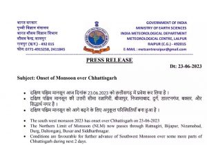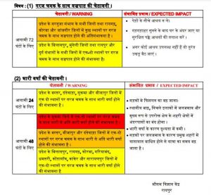 अगले 24 घंटे में राज्य के दक्षिणी हिस्से बस्तर, दंतेवाड़ा, सुकमा और बीजापुर में एक दो स्थानों पर गरज चमक के साथ भारी बारिश हो सकती है. वहीं, 48 घंटे में बिलासपुर, रायगढ़, कोरबा, गरियाबंद, धमतरी, कोंडागांव, कांकेर और नारायणपुर में एक दो स्थानों पर गरज चमक के साथ भारी बारिश की संभावना है.