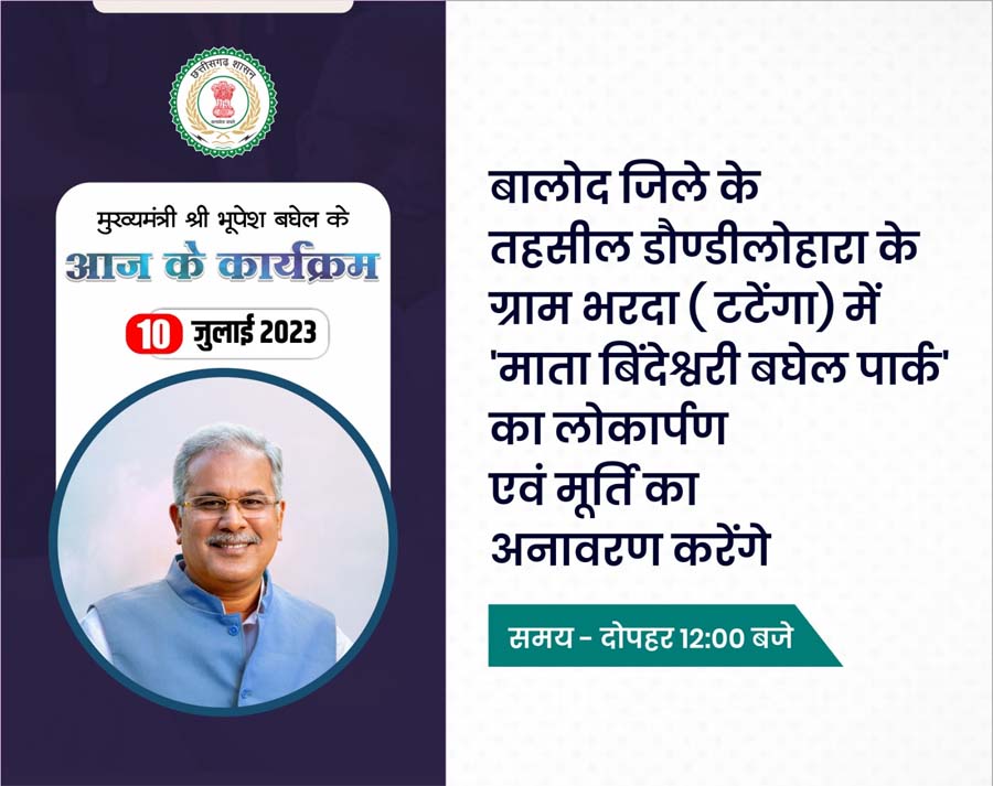 निर्धारित कार्यक्रम के अनुसार मुख्यमंत्री भूपेश बघेल पुलिस ग्राउण्ड हेलीपेड रायपुर से हेलीकॉप्टर द्वारा पूर्वान्ह 11.30 बजे प्रस्थान कर पूर्वान्ह 11.55 बजे बालोद जिले के डौंडीलोहारा विकासखण्ड के ग्राम टटेंगा पहुंचेंगे और वहां ग्राम भरदा (टटेंगा) में माता बिंदेश्वरी बघेल के नाम से निर्मित बिंदेश्वरी पार्क का लोकार्पण एवं मूर्ति का अनावरण करेंगे. मुख्यमंत्री ग्राम टटेंगा से दोपहर 1.20 बजे प्रस्थान कर दोपहर 1.45 बजे पुलिस ग्राउण्ड हेलीपेड रायपुर पहुंचेंगे.