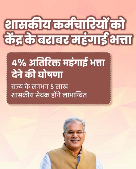 मुख्यमंत्री ने लगभग 5 लाख शासकीय सेवकों के महंगाई भत्ते में 4 प्रतिशत की बढ़ोत्तरी की घोषणा की. इस प्रकार मूल वेतन पर अब तक कुल 42 प्रतिशत बढ़ोत्तरी हो चुकी है. 4 प्रतिशत बढ़ोत्तरी होने से 800 करोड़ रुपए का अतिरिक्त व्यय राज्य सरकार को पड़ेगा. 37000 संविदा कर्मियों के एकमुश्त संविदा वेतन में 27 प्रतिशत वृद्धि की गई है. इससे 350 करोड़ रुपए का अतिरिक्त व्यय राज्य सरकार को पड़ेगा. दैनिक वेतन भोगियों के वेतन में 4000 रुपए की मासिक वृद्धि की गई है. इससे 240 करोड़ रुपए का अतिरिक्त व्यय राज्य सरकार को पड़ेगा. 1650 अतिथि शिक्षकों के मानदेय में 2 हजार रुपए मासिक की बढ़ोत्तरी की गई है. इससे 4 करोड़ रुपए का अतिरिक्त व्यय राज्य सरकार को पड़ेगा. 6000 पटवारियों को 500 रुपए मासिक संसाधन भत्ता मिलेगा. इससे 4 करोड़ रुपए का अतिरिक्त व्यय राज्य सरकार को पड़ेगा. सभी शासकीय सेवकों को छठवें वेतनमान के स्थान पर सातवें वेतनमान पर बी श्रेणी शहर हेतु 9 प्रतिशत एवं सी तथा अन्य शहरों हेतु 6 प्रतिशत गृह भाड़ा भत्ता दिया जाएगा. इससे 265 करोड़ रुपए का अतिरिक्त व्यय राज्य सरकार को पड़ेगा. सभी पुलिस आरक्षकों को 8000 रुपए किट वार्षिक भत्ता दिया जाएगा. इसका 40 करोड़ रुपए का अतिरिक्त व्यय राज्य सरकार को पड़ेगा.