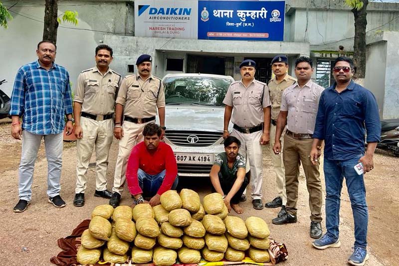 भिलाई- पुलिस ने नशे के खिलाफ कार्रवाई करते हुए दो गांजा तस्करा को गिरफ्तार किया है. जिले में नशे के अवैध सौदागरों के खिलाफ मुहिम चलाया जा रहा है. थाना कुम्हारी की एक संयुक्त टीम गठित कर टीम को कार्यवाही हेतु लगाया गया था. टीम द्वारा नशे के कारोबारियों पर सतत् निगाह रखी जा रही थी, विशेष सूत्र भी लगाये गये थे. जेल से रिहा हुये पूर्व के आदतन नशे के कारोबारियों पर निगाह रखी जा रही थी. इसी दौरान पुलिस टीम को विषेष सूत्रों से पता चला कि सफेद रंग की टाटा मांजा कार क्रमांक- CG 07 AK 4194 में 02 व्यक्ति सवार होकर रायपुर से दुर्ग अवैध मादक पदार्थ परिवहन कर दुर्ग की ओर आ रहे है. टीम द्वारा 53 कुम्हारी टोल प्लाजा पर घेराबंदी कर सफेद रंग की टाटा मांजा कार क्रमांक- CG 07 AK 4194 को रोक कर चेक किया गया, वाहन में सवार 01. गुड्डू यादव निवासी राजस्थान 02. अकलेष लोधी निवासी शिवपुर म.प्र. को गिरफ्तार किया गया.
