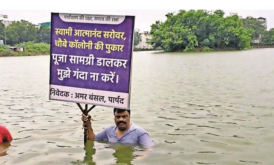 दरअसल, शनिवार को स्वामी आत्मानंद करबला सरोवर में बारिश के बीच वार्ड नंबर 39 के भाजपा पार्षद अमर बंसल ने सांकेतिक अर्ध जल समाधि लेकर जल संरक्षण की अलख जगाने का काम किया है. चौबे कॉलोनी, समता कॉलोनी इलाके के पार्षद बंसल ने कहा कि, तालाब में अलग-अलग धर्मों से जुड़ी चीजों का विसर्जन होता है. इससे तालाब का पानी दूषित हो रहा है.