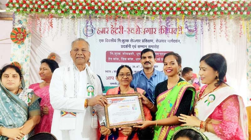 दुर्ग- हमर हटरी छत्तीसगढ़ संस्था द्वारा स्वामी विवेकानंद सभागार दुर्ग में हमर हटरी स्वरोजगार की पटरी कार्यक्रम अंतर्गत एक दिवसीय निःशुल्क रोजगार प्रशिक्षण, रोजगार मार्गदर्शन, प्रदर्शनी एवं सम्मान समारोह का आयोजन किया गया था. इस कार्यक्रम में स्वरोजगार स्थापित करने कई प्रकार के उत्पादों का निःशुल्क प्रशिक्षण एवं विभिन्न क्षेत्रों में उत्कृष्ट कार्य करने वाले कलाकारों का सम्मान किया गया. इसी क्रम में नेहरू युवा केन्द्र दुर्ग की मास्टर ट्रेनर एवं शौर्य युवा संगठन कोडिया के सांस्कृतिक व कला विभाग सह-प्रभारी गायत्री निषाद को आदिवासियों की विलुप्तप्राय हस्तशिल्पकला गोदना के संरक्षण के साथ ग्रामीण महिलाओं व युवतियों को स्वरोजगार के लिए प्रशिक्षित करने के लिए कार्यक्रम के मुख्यातिथि प्रदेश के गृहमंत्री ताम्रध्वज साहू ने प्रशस्ति पत्र प्रदान कर सम्मानित किया.