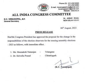 बता दें कि, कांग्रेस ने बीते 31 जुलाई को 5 राज्यों में चुनाव के मद्देनजर सीनियर ऑब्जर्वर और ऑब्जर्वर की नियुक्ति की थी. इसमें छत्तीसगढ़ के लिए प्रीतम सिंह सीनियर ऑब्जर्वर और मीनाक्षी नटराजन को ऑब्जर्वर बनाया गया था. अब कांग्रेस अध्यक्ष ने मिनाक्षी नटराजन को तेलंगाना का ऑब्जर्वर बनाया है. वहीं छत्तीसगढ़ की जिम्मेदारी डॉ. सिरिवेला प्रसाद को दी गई है. इस संबंध में आदेश जारी कर दिया गया है.