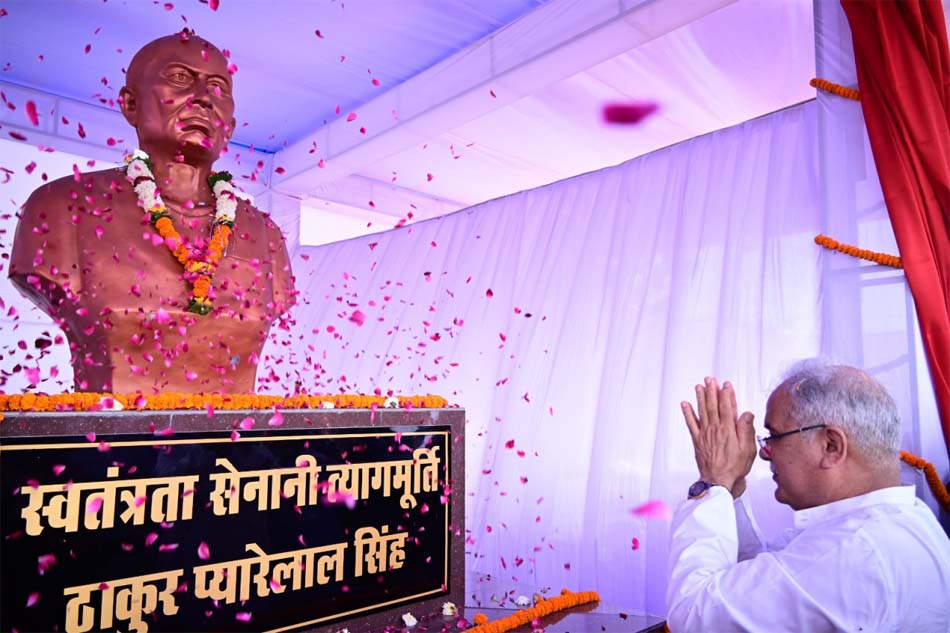 रायपुर : मुख्यमंत्री भूपेश बघेल ने राजनांदगांव विकासखंड के ग्राम सेम्हरादैहान में स्वतंत्रता संग्राम सेनानी ठाकुर प्यारे लाल सिंह की प्रतिमा का अनावरण किया. मुख्यमंत्री भूपेश बघेल ने इस दौरान ठाकुर प्यारे लाल सिंह उद्यान में पौधरोपण किया. उन्होंने ठाकुर प्यारे लाल सिंह के परिवारजनों से भी मुलाकात की.
