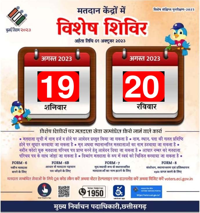 छत्तीसगढ़ की मुख्य निर्वाचन पदाधिकारी रीना बाबासाहेब कंगाले ने बताया कि इन विशेष शिविर तिथियों को राज्य भर में सभी मतदान केन्द्रों में बूथ लेवल अधिकारियों एवं अभिहित अधिकारियों को आवेदन प्राप्त करने के लिए निर्देशित किया गया है. सामान्यतः शनिवार एवं रविवार को अधिकांश संस्थानों में अवकाश रहता है इसलिए जो भी नागरिक अपना नाम जुड़वाना चाहते हैं वे कार्यालयीन समयावधि में बूथ जाकर अपने बूथ लेवल अधिकारी की सहायता से अपना आवेदन प्रस्तुत कर सकते हैं. श्रीमती कंगाले ने बताया कि मतदाता सूची को शुद्ध एवं त्रुटिरहित बनाने पुनरीक्षण के दौरान सभी जिलों एवं विधानसभाओं में सघन कार्यक्रम चलाए जा रहे हैं. इस दौरान छूटे हुए युवा, नागरिकों एवं समाज के वंचित वर्गों को अधिक से अधिक जागरूक कर उनका नाम मतदाता सूची में जोड़े जाने के प्रयास किए जाएँगे. उन्होंने प्रदेश के आम नागरिकों से पुनरीक्षण में अधिक से अधिक ऑनलाइन आवेदन वोटर हेल्पलाइन एप या फिर वोटर सर्विस पोर्टल https://voters.eci.gov.in के माध्यम से करने की अपील की है.
