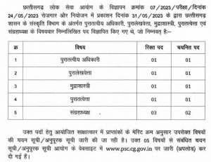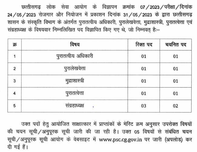रायपुर- लोक सेवा आयोग द्वारा संस्कृति विभाग के अंतर्गत पुरातत्वीय अधिकारी, पुरालेखवेत्ता, मुद्राशास्त्री, पुरातत्वेत्ता एवं संग्रहाध्यक्ष के साक्षात्कार में प्राप्त अंको के मेरिट क्रम के आधार पर वर्गवार चयन सूची जारी कर दिया है. अभ्यर्थी अधिक जानकारी के लिए लोक सेवा आयोग के वेबसाईट www.psc.cg.gov.in पर अवलोकन कर सकते है.