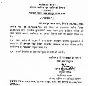 योजना, आर्थिक एवं सांख्यिकी विभाग द्वारा जारी आदेश में उल्लेखित किया गया है कि ‘‘मुख्यमंत्री अथवा उनके द्वारा नामांकित व्यक्ति’’ को राज्य योजना आयोग, छत्तीसगढ़ का ‘‘अध्यक्ष’’ नियुक्त करने का प्रावधान किया गया है. यह आदेश इसी तारतम्य में जारी किया गया है.