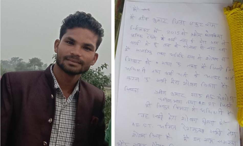 यह मामला धमतरी के मगरलोड का है, जहां कर्मचारी रवि कुमार ने फांसी लगाकर जान दे दी. रवि कुमार रायपुर में चंगोराभाठा स्थित बिजली ऑफिस में काम करता था. खुदकुशी से पहले उसने अपने वॉट्सऐप स्टेटस पर लगाये सुसाइड नोट में कर्मचारी ने अपने अधिकारी और ठेकेदार पर शोषण के आरोप लगाए थे.