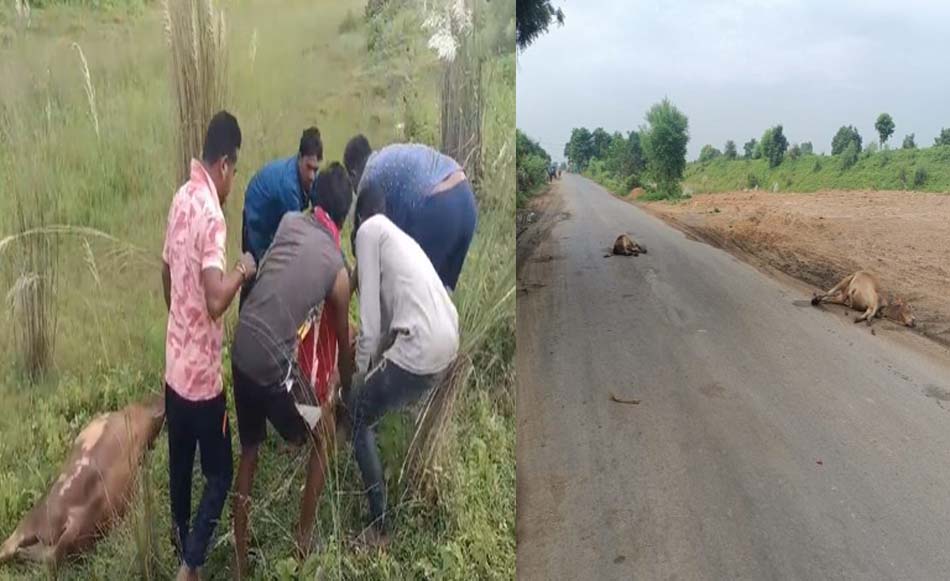 कोरबा : कोरबा जिले के उरगा थाना क्षेत्र में तेज रफ्तार अज्ञात वाहन ने मवेशियों को रौंद दिया. हादसे में करीब 9 मवेशियों की दर्दनाक मौत हो गई है. ग्रामीणों ने जब खून से सनी सड़क और मवेशियों के बिछी लाश का मंजर देखा तो वे आग बबूला हो गए. घटनास्थल से मवेशियों के शवों को उठाकर ग्रामीण सड़क के किनारे कर रहे हैं.