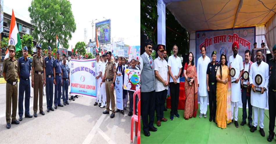 रायपुर : एनसीसी केडिट्स के द्वारा पुनीत सागर अभियान के माध्यम से लोगो को तालाबों, नदियों और जलाशयों को स्वच्छ रखने का लगातार संदेश दिया जा रहा है. इसी कड़ी में आज सुबह राजधानी रायपुर के तेलीबांधा तालाब में पुनीत सागर अभियान का कार्यक्रम आयोजित हुआ. इस मौके पर लोगो को तालाबों, नदियों और जलाशय को स्वच्छ रखने के लिए लोगो को प्रेरित करने के लिए एनसीसी कैडेटों को सम्मानित किया गया. इस दौरान एनसीसी कैडेटों द्वारा जल संरक्षण और उसके सदुपयोग से संबंधित नारे भी लगाए. आज के कार्यक्रम में एनसीसी रायपुर ग्रुप के विभिन्न संस्थाओं के 2000 से अधिक कैडेट्स ने भाग लिया.