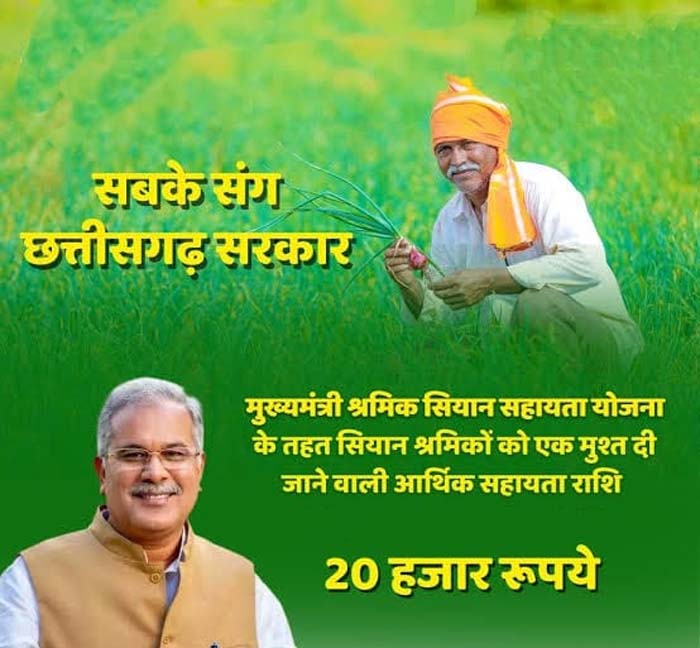 श्रम पदाधिकारी ने बताया कि संचालित योजना के तहत पंजीकृत श्रमिक को मुख्यमंत्री श्रमिक सियान सहायता योजना के अंतर्गत् 59 वर्ष से 60 वर्ष के श्रमिकों को एक मुश्त 20 हजार रूपए की आर्थिक सहायता श्रम विभाग द्वारा दिया जाता है. योजना का लाभ लेने हेतु श्रम विभाग व लोक सेवा केन्द्र, व्हीएलई के माध्यम से दस्तावेजों के साथ पंजीयन करा सकते हैं. अधिक जानकारी के लिए कल्याण अधिकारी श्री ज्ञानवन्त पाण्डेय मोबाई नम्बर +91-7999257119 एवं कल्याण निरीक्षक अभिषेक यादव मोबाईल नम्बर +91-9111122448 से संपर्क किया जा सकता है.