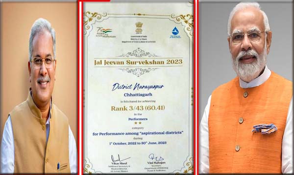 रायपुर- मुख्यमंत्री भूपेश बघेल के नेतृत्व में संचालित जनकल्याणकारी योजनाओं और कार्यक्रमों को राष्ट्रीय स्तर पर लगातार सराहा जा रहा है. इसी कड़ी में एक और बड़ी उपलब्धि जुड़ गई है. नारायणपुर जिले को आकांक्षी जिले के अंतर्गत जलजीवन सर्वेक्षण 2023 में उत्कृष्ट कार्य के लिए प्रशस्ति पत्र से केंद्रीय जलशक्ति, पेयजल एवं स्वच्छता विभाग ने सम्मानित किया है. मुख्यमंत्री भूपेश बघेल ने इस सम्मान के लिए नारायणपुर जिलावासियों को तथा इस कार्य में लगे जलजीवन मिशन के अधिकारियों एवं कर्मचारियों को बधाई दी है.