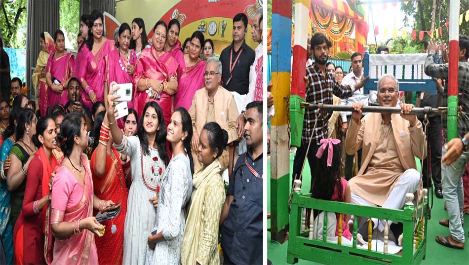 छत्तीसगढ़ी लोक कलाकारों के दल ने छत्तीसगढ़ी गीत-संगीत से अनोखा समा बांधा. ‘तीजा पोरा के तिहार बहिनी नीक लागे मोर और गाड़ा गाड़ा जोहार…‘ जैसे गानों पर महिलाएं जमकर थिरकीं. मुख्यद्वार के पास रईचुली झूले की व्यवस्था थी, जिसका महिलाओं ने जमकर आनंद लिया. मुख्यमंत्री बघेल ने भी महिलाओं का उत्साह बढ़ाते हुए सपरिवार रईचुली झूले का आनंद लिया. मुख्यमंत्री संग सेल्फी लेने माताएं बहनें उत्साहित दिखी.