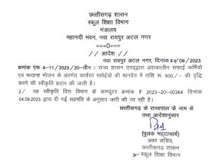 गौरतलब है कि मुख्यमंत्री भूपेश बघेल ने राजधानी रायपुर में आयोजित 15 अगस्त स्वतंत्रता दिवस के मुख्य समारोह में छत्तीसगढ़ में शिक्षा सुविधाओं में योगदान देने वाले अंशकालीन सफाई कर्मी एवं मध्यान्ह भोजन से जुड़े रसोईयों के मानदेय में 500 रूपए प्रति माह वृद्धि की घोषणा की थी.