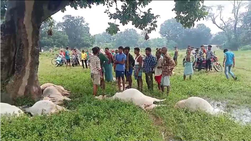 इस दौरान अचानक आकाशी बिजली गिरने पर आधा दर्जन से अधिक मवेशियों की मौत हो गई. घटना में कुछ मवेशी बच गए. वहीं खेत में काम करने गए ग्रामीणों की नजर जब मरे पड़े मवेशियों पर पड़ी तब इसकी सूचना गांव में जाकर दी. जिसके बाद घटनास्थल पर मवेशियों के मालिक और ग्रामीणों की भीड़ एकत्रित हो गई. मृत मवेशियों में तीन गाय दो बछड़ा और एक बैल है.