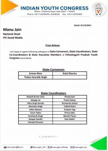 Newsbeat छत्तीसगढ़ युवा कांग्रेस सोशल मीडिया विभाग में नई कार्यकारिणी घोषित, देखें लिस्ट Chhattisgarh Aajtak October 1, 2023 छत्तीसगढ़ युवा कांग्रेस सोशल मीडिया विभाग में नई कार्यकारिणी घोषित की गई है. Post navigation Previous शासकीय आई.टी.आई. के विभिन्न पदों की भर्ती के लिए दस्तावेज सत्यापन 04 से 06 अक्टूबर तकNext भीषण सड़क हादसे में दो सगे भाईयों की मौत, बोलेरो के उड़े परखच्चे Related Stories राजीव भवन रायपुर में दीपक बैज ने गणतंत्र दिवस 2026 पर फहराया तिरंगा Newsbeat राजीव भवन रायपुर में दीपक बैज ने गणतंत्र दिवस 2026 पर फहराया तिरंगा January 26, 2026 मुख्यमंत्री ने बिलासपुर में फहराया तिरंगा, परेड की ली सलामी Newsbeat मुख्यमंत्री ने बिलासपुर में फहराया तिरंगा, परेड की ली सलामी January 26, 2026 सहकारी बैंक दुर्ग में प्रीतपाल बेलचंदन अध्यक्ष ने किया ध्वजारोहण Newsbeat सहकारी बैंक दुर्ग में प्रीतपाल बेलचंदन अध्यक्ष ने किया ध्वजारोहण January 26, 2026
