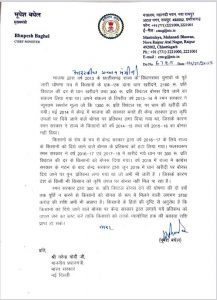 पत्र में मुख्यमंत्री भूपेश बघेल ने लिखा- केंद्र सरकार बोनस पर प्रतिबंध हटाये ताकि किसानों को उनके न्यायोचित हक की राशि मिल पाए