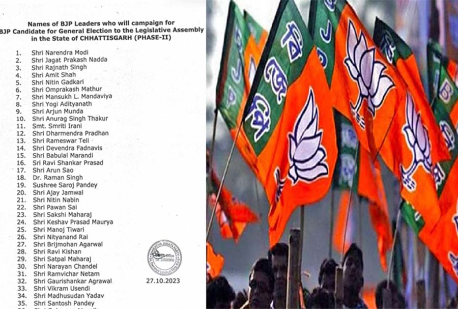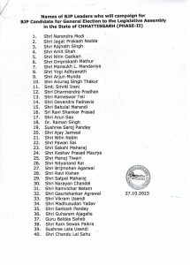 छत्तीसगढ़ की 90 विधानसभा सीटों के लिए 2 चरणों में चुनाव होना है. पहले चरण के लिए लिस्ट जारी करने के बाद BJP ने छत्तीसगढ़ में होने वाले दूसरे चरण के चुनाव के लिए स्टार प्रचारकों की दूसरी लिस्ट जारी कर दी है. इस लिस्ट में PM मोदी, अमित शाह, जेपी नड्डा कुल समेत 40 नाम शामिल हैं.