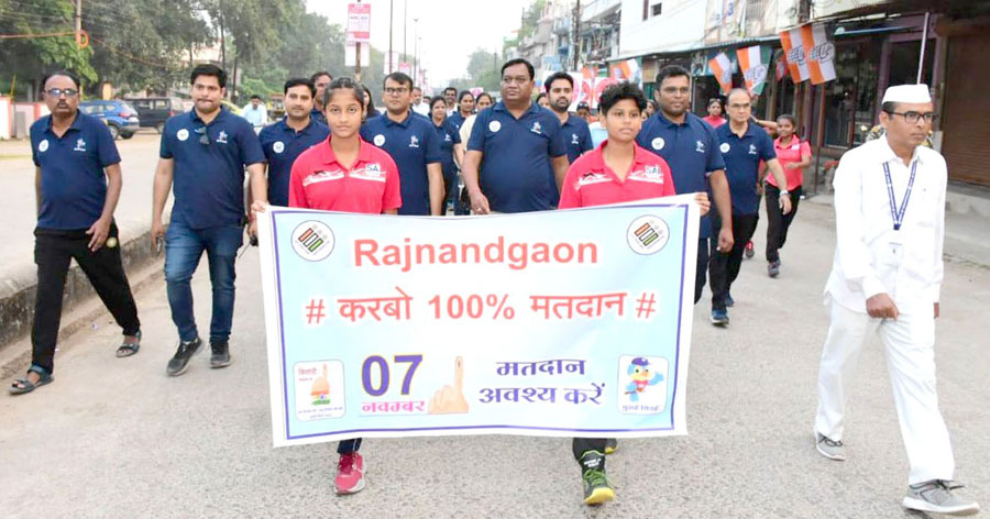 राजनांदगांव – लोकतंत्र के उत्सव में हर वर्ग की सहभागिता सुनिश्चित करने के लिए जिला प्रशासन द्वारा अनूठी पहल करते हुए स्वीप अंतर्गत मतदाता जागरूकता के लिए कलेक्टोरेट स्वीप गार्डन से वाक द सिटी पैदल रैली का आयोजन किया गया. हर एक व्यक्ति का मत महत्वपूर्ण है, यह संदेश जन-जन तक पहुंचाने के लिए उमंग एवं उत्साह के साथ सभी अधिकारियों-कर्मचारियों एवं बच्चों व खिलाडिय़ों का कारवां निकला. वाक द सिटी कार्यक्रम के तहत कलेक्टर एवं जिला निर्वाचन अधिकारी डोमन सिंह, जिला पंचायत सीईओ एवं स्वीप नोडल अधिकारी अमित कुमार सहित जिला कार्यालय के अधिकारियों-कर्मचारियों, स्कूली बच्चों व खिलाडिय़ों ने कलेक्टोरेट स्वीप गार्डन से ठाकुर प्यारे लाल चौक, बजरंग चौक, संगम चौक, बख्तावर चाल से ममता नगर, भदौरिया चौक होते हुए वापस होकर कलेक्टोरेट स्वीप गार्डन तक पैदल रैली निकालकर शत-प्रतिशत मतदान का संदेश दिया.