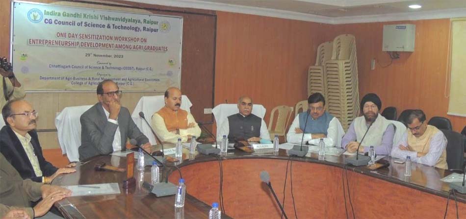 रायपुर : छत्तीसगढ़ विज्ञान एवं प्रौद्योगिकी परिषद एवं इंदिरा गांधी कृषि विश्वविद्यालय रायपुर के संयुक्त तत्वाधान में एकदिवसीय कार्यशाला कृषि छात्रों में उद्यमिता विकास पर आयोजित किया गया. इसके मुख्य अतिथि एस. एस. बजाज महानिदेशक सी कास्ट एवं विशिष्ट अतिथि डॉ. गिरीश चंदेल कुलपति इंदिरा गांधी कृषि विश्वविद्यालय की गरिमामय उपस्थिति में सम्पन्न हुआ. कार्यशाला का प्रारंभ दीप प्रज्जवलन कर अतिथियों का स्वागत डॉ. विजय कुमार चौधरी विभागाध्यक्ष, कृषि अर्थशास्त्र के द्वारा किया गया. बजाज ने अपने अध्यक्ष उद्बोधन में छात्रों को उद्यमिता विकास के बहुमूल्य कड़ी कहा एवं कृषि के क्षेत्र में उद्यमिता विकास के अपार संभावना हेतु विज्ञान एवं प्रौद्योगिकी परिषद के विभिन्न कार्यक्रम द्वारा समन्वित विकास व बाजार आधारित नवोन्मेंशी तकनीक पर कार्य करने की प्रेरणा दी. डॉ चंदेल ने छात्रों को कृषि के व्यवसायीकरण एवं बाजार आधारित नवोन्मेषी उत्पादों के प्रबंधन एवं ग्रामीण प्रबंधन के द्वारा राज्य के विकास में सहभागिता बनने हेतु आहवन किया. कार्यशाला के स्वागत उद्बोधन डॉ संजय कुमार जोशी के द्वारा कृषि में उद्यमिता विकास पर प्रकाश डाला एवं इस कार्यशाला का छात्रों पर महत्वपूर्ण प्रभाव एवं विशेषताओं के बारे में बताया. कार्यशाला के समन्वयक अखिलेश त्रिपाठी वैज्ञानिक डी ने विश्वविद्यालय के साथ-समनवय स्थापित की एवं डॉ प्रवीण कुमार वर्मा के द्वारा समस्त प्रतिभागियों, मुख्य अतिथि, विशिष्ट अतिथि, निर्देशक एवं अधिष्ठाताओं की सहभागिता हेतु धन्यवाद ज्ञापन प्रस्तुत किया.