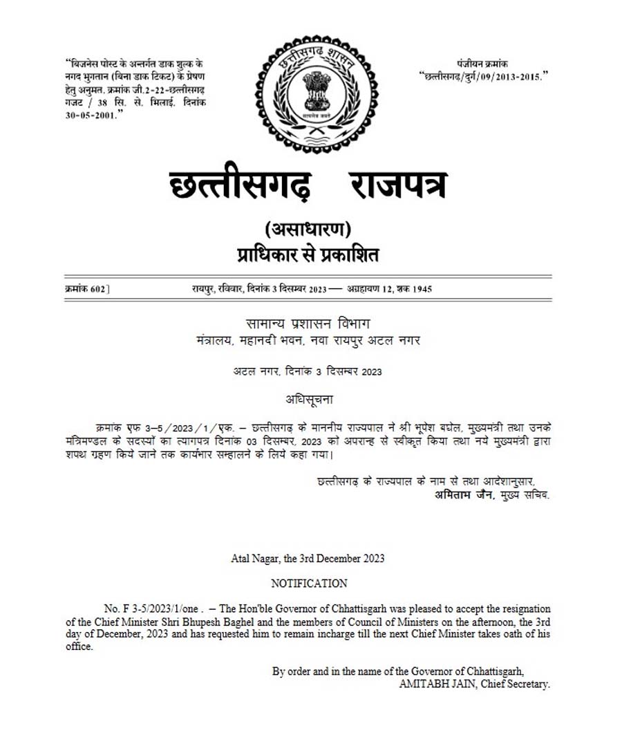 भूपेश बघेल और उनके मंत्रिमंडल के सदस्यों के त्याग पत्र के संबंध में दो अधिसूचना जारी की गई है. पहली अधिसूचना राजभवन की तरफ से राजभवन के सचिव के हस्ताक्षर से जारी किया गया है. दूसरी अधिसूचना सामान्य प्रशासन विभाग (जीएडी) की तरफ से मुख्य सचिव के हस्ताक्षर से जारी किया गया है.