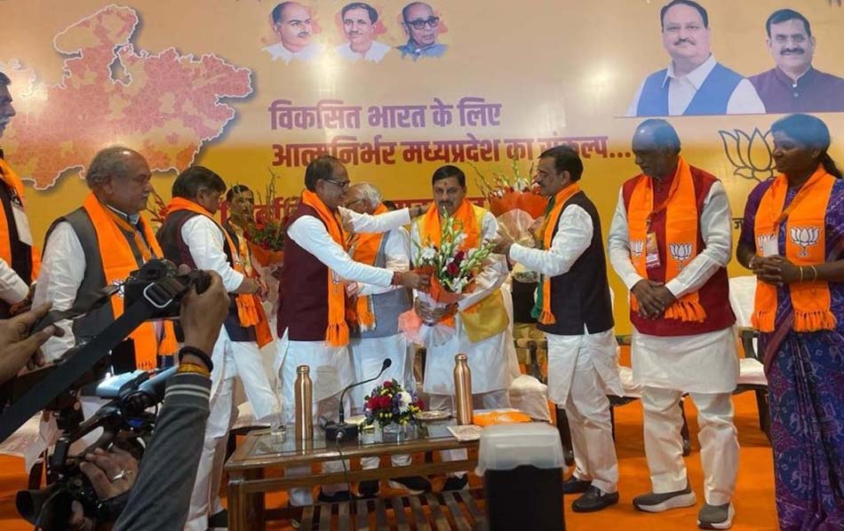 #WATCH | BJP leaders including Shivraj Singh Chauhan, congratulate party leader Mohan Yadav after he was named as the new Chief Minister of Madhya Pradesh pic.twitter.com/SibAIt4Cnh
