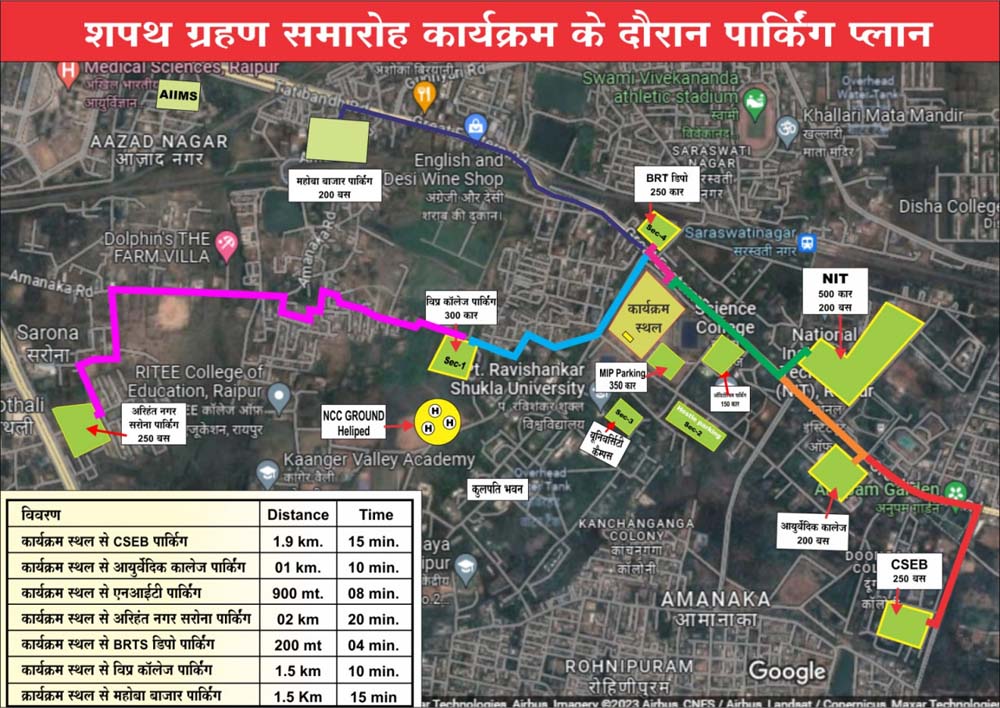 रायपुर- छत्तीसगढ़ के नए मुख्यमंत्री विष्णुदेव साय और उनके मंत्रिमंडल के सदस्य आज प्रधानमंत्री नरेंद्र मोदी की उपस्थिति में छत्तीसगढ़ के नए आज दोपहर 2 बजे साइंस कॉलेज मैदान मे शपथ ग्रहण करेंगे. आज नवनिर्वाचित मुख्यमंत्री छत्तीसगढ़ शासन का शपथ ग्रहण समारोह का आयोजन सांइस कालेज मैदान रायपुर में प्रस्तावित है. उक्त कार्यक्रम में सम्मिलित होने हेतु भारत के प्रधानमंत्री नरेन्द्र मोदी, केन्द्रीय मंत्री मण्डल के सदस्य गण, अनेक राज्यों के मुख्यमंत्री गण तथा राज्य के अनेक जिलों से विशिष्ठ व्यक्तियों के साथ ही साथ भारी संख्या में आमजन उपस्थित होंगे. इस दौरान सुगम सुरक्षित यातायात व्यवस्था हेतु यातायात पुलिस रायपुर द्वारा निम्नानुसार मार्ग एवं पार्किंग व्यवस्था निर्धारित किया गया हैः-