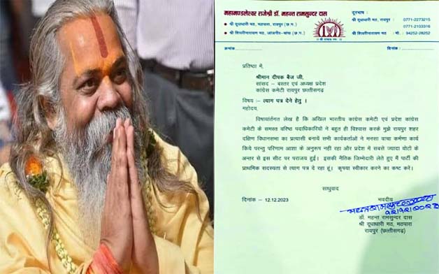 महंत रामसुंदर दास ने अपनी हार की नैतिक जिम्मेदारी लेते हुए पार्टी से इस्तीफा दे दिया है. उन्होंने आज कांग्रेस के प्रदेश अध्यक्ष दीपक बैज को अपना इस्तीफा सौंपा.