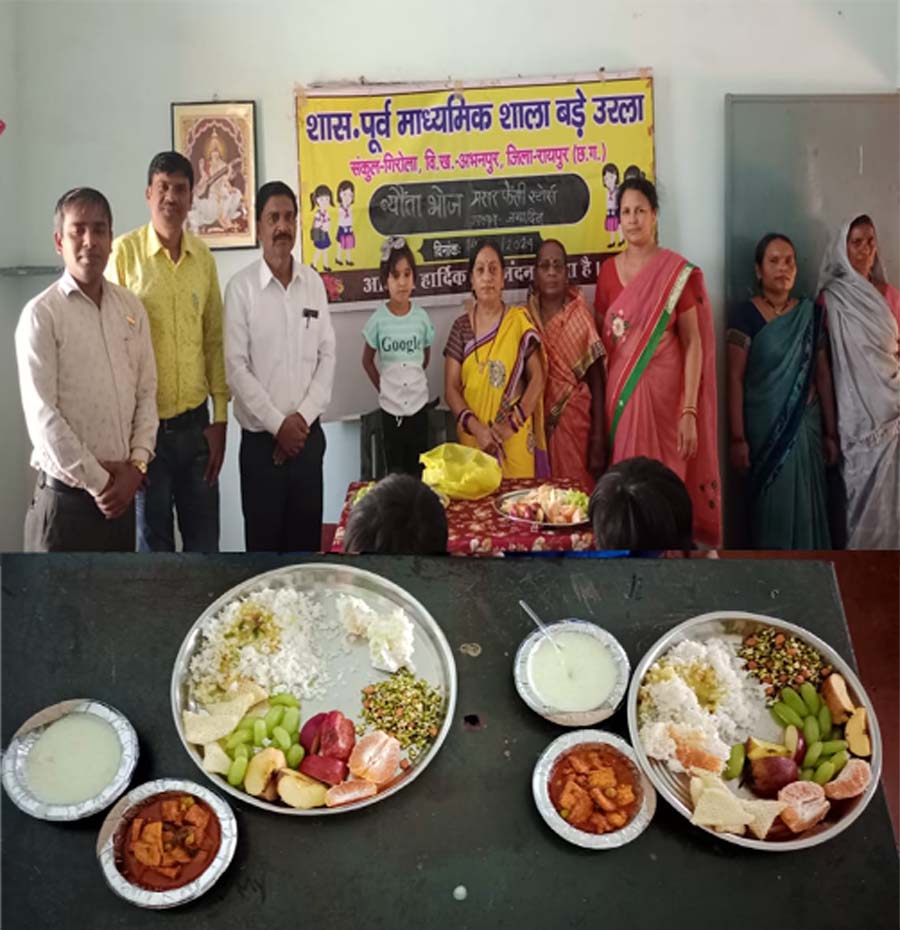 रायपुर- विकास खंड अभनपुर के अंतर्गत शास.पूर्व.माध्यमिक शाला बड़े उरला में प्रखर फैन्सी स्टोर्स के संचालक प्रदीप साहू ने अपने पुत्र प्रखर के जन्मदिन पर विद्यालयीन बच्चों को न्योजा भोज कार्यक्रम के तहत स्वादिष्ट भोजन कराया. विद्यालय के बच्चों को सेव, अंगूर, संतरा, अंकुरित चना मूंग, खीर, पनीर मटर की सब्जी व केक बच्चों को खिलाया गया जिससे बच्चों के चेहरे खिल गए.