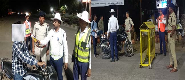 यातायात पुलिस दुर्ग द्वारा बनाये गये 26 फिक्स पाइंट पर वाहनो की चेकिंग प्रारंभ गई है. जो भी वाहन चालक शराब सेवन करना पाया गया उसका वाहन दिनांक 26 मार्च को न्यायालय प्रस्तुत किया जावेगा साथ ही मोडिफाईड सायलेंसर हुड़दग करने वाले वाहन चालक, तीन सवारी, बिना नंबर, ब्लेक फिल्म वाले वाहन भी जप्त किये जायेगें.