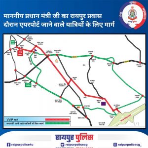 यात्री रूट डायवर्सन का ध्यान रखते हुए अतिरिक्त समय लेकर घर से निकले एवं निम्नानुसार वैकल्पिक मार्ग का उपयोग कर आवागमन कर सकते हैः- 01. माना विमानतल जाने के लिए पचपेड़ीनाका चौक/ केनाल रोड से लालपुर-देवपुरी (धमतरी रोड) होकर माना कैम्प से पुराने टर्मिनल में अपना वाहन पार्क कर विमानतल में प्रवेश कर सकेंगे. 02. जी.ई. रोड से मैग्नेटो माल-लाभांडी चौक-ज़ोरा से सेरीखेड़ी होकर नया रायपुर प्रवेश मार्ग से जैनम भवन मार्ग से पुराना टर्मिनल में अपना वाहन पार्क कर विमानतल में प्रवेश कर सकेंगे. राजभवन की व्यवस्था:- दिनांक 23 अप्रेल 2024 को माननीय प्रधानमंत्री, भारत सरकार का छ.ग. राजभवन में रात्रि विश्राम कार्यक्रम प्रस्तावित है. इस दौरान सुरक्षा व्यवस्था को दृष्टिगत रखते हुए दिनांक 23 अप्रेल को संध्या 04 बजे से दिनांक 24 अप्रेल 2024 को सुबह 10 बजे तक राजभवन के आसपास चारो ओर निम्नानुसार मार्ग में सामान्य आवागमन बाधित रहेगा:- 01.कालीमाता मंदिर तिराहा से राजभवन की ओर 02.खजाना चौक से राजभवन की ओर 03.पुराना पीएचक्यू तिराहा से राजभवन की ओर 04.बिजली आफिस तिराहा से राजभवन की ओर 05. बंजारी चौक से राजभवन की ओर अपील – प्रधानमंत्री के आवागमन के दौरान सुरक्षा के दृष्टिकोण से व्हीआईपी रूट एवं उपरोक्तानुसार मार्गों में यातायात बाधित रहेगी. असुविधा से बचने के लिए अन्य वैकल्पिक मार्गो का उपयोग कर सुगम आवागमन करें.