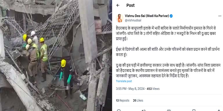 अपने सोशल मीडिया हैंडल X पर उन्होंने लिखा है कि – हैदराबाद के बाचूपल्ली इलाके में भारी बारिश के चलते निर्माणाधीन इमारत के गिरने से जांजगीर-चांपा जिले के 3 लोगों सहित ओडिशा के 7 मजदूरों के निधन की दुःखद खबर प्राप्त हुई. ईश्वर से दिवंगतों की आत्मा की शांति और उनके परिजनों को संबल प्रदान करने की प्रार्थना करता हूं. दुःख की इस घड़ी में छत्तीसगढ़ सरकार उनके साथ खड़ी है. जांजगीर-चांपा जिला प्रशासन को हैदराबाद के स्थानीय प्रशासन से सामंजस्य बनाते हुए मृतकों के परिजनों के बारे में जानकारी जुटाकर, आवश्यक सहायता देने के निर्देश दे दिए हैं.