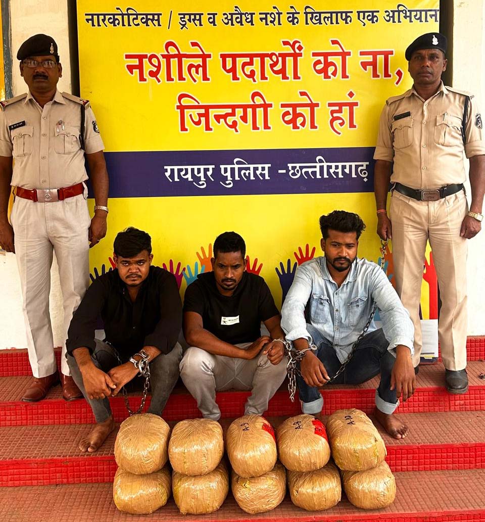 इसी तारतम्य में को एण्टी क्राईम एण्ड साईबर यूनिट की टीम को सूचना प्राप्त हुई कि थाना मंदिर हसौद क्षेत्रांतर्गत रेलवे फाटक के पास दोपहिया वाहन में सवार कुछ व्यक्ति अपने पास गांजा रखें है तथा कहीं जाने के फिराक में है. पुलिस की संयुक्त टीम द्वारा उक्त स्थान पर जाकर मुखबीर द्वारा बताये दोपहिया वाहन एवं हुलिये के व्यक्तियों को चिन्हांकित कर पकड़ा गया. पूछताछ में व्यक्तियों ने अपना नाम अविनाश यादव, राहुल नंदा एवं शनि मरावी निवासी मण्डला मध्यप्रदेश का होना बताया. टीम के सदस्यों द्वारा उनके पास रखे बोरी की तलाशी लेने पर बोरी में गांजा रखा होना पाया गया. जिस पर टीम के सदस्यों द्वारा तीनों आरोपियों को गिरफ्तार कर उनके कब्जे से 21 किलो 746 ग्राम गांजा तथा घटना में प्रयुक्त 02 नग दोपहिया वाहन एवं 04 नग मोबाईल फोन जुमला कीमती लगभग 4,50,000/- रूपये जप्त कर आरोपियों के विरूद्ध थाना मंदिर हसौद में अपराध क्रमांक 398/2024 धारा 20बी नारकोटिक्स एक्ट का अपराध पंजीबद्ध कर कार्यवाही की गई.