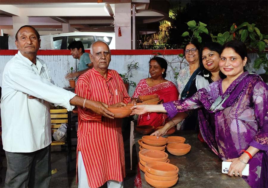 पक्षियों को बचाने आगे आई ऊर्जा फाउंडेशन की महिलाएं, दाना-पानी के लिए मंदिर प्रांगण में सकोरा वितरण किया