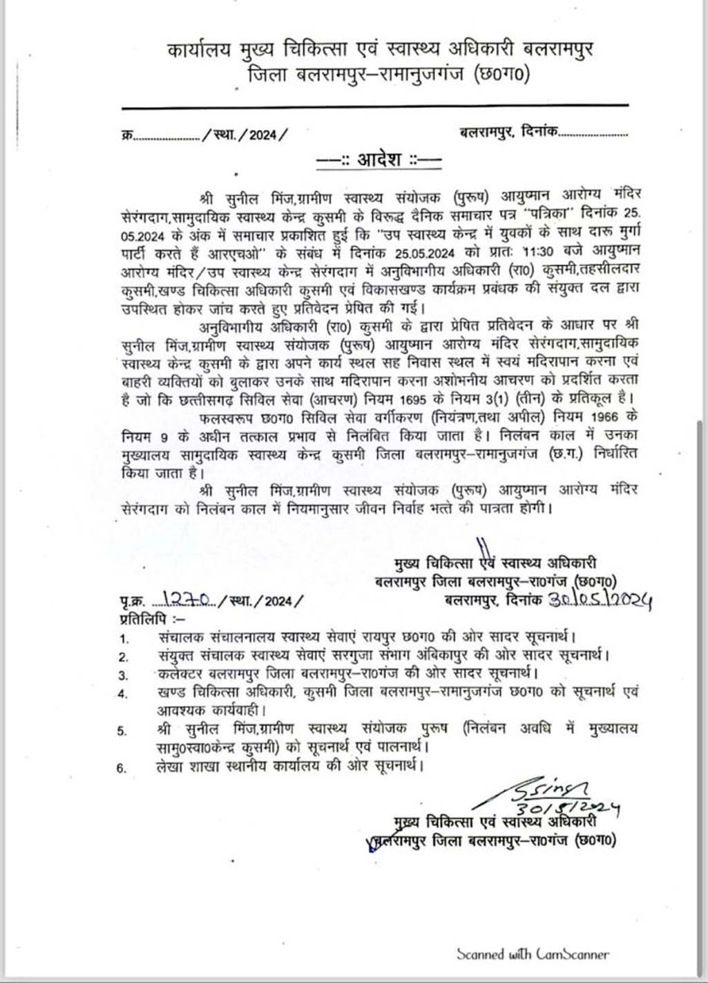 जानकारी के अनुसार, बलरामपुर के सामरी सेक्टर के अंतर्गत स्थित उप स्वास्थ्य केंद्र सेरंगदाग में पदस्थ आरएचओ सुनील मिंज अपने दोस्तों के साथ शराब और मुर्गा पार्टी कर रहा था. जिसका ग्रामीणों ने चुपके से वीडियो बना लिया. इस पार्टी का वीडियो वायरल होने के बाद ग्रामीणों ने कार्रवाई की मांग की थी. जिसपर संज्ञान लेते हुए सीएमएचओ डॉ. बसंत सिंह ने RHO को निलंबित कर दिया है.