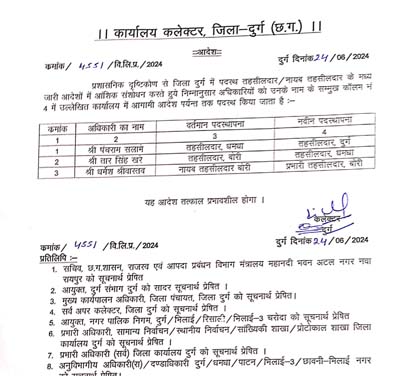 सलामे होंगे दुर्ग के नए तहसीलदार, कलेक्टर ने जारी किया आदेश